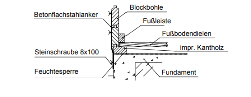 Auf das Fundament, mindestens unter den Bodenriegeln, ist eine Feuchtigkeitssperre (z.B. Grundmauerpappe) aufzubringen. Das Fundament ist mit jeder Hausecke mit einem Flachstahlanker zu verbinden. Der Flachstahlanker muß bis in die zweite Bohlenschicht geführt werden. Bei Seitenwänden > 3,00 m ist jeden weiteren lfdm. Ein Bodenanker mehr zu verwenden. Die Feuchtesperre, Betonflachstahlanker und Befestigungsmittel dafür gehört nicht zum Lieferumfang. Die höhenverstellbaren Pfostenträger sind auf ca. 2/3 ihrer Länge herausgeschraubt zu montieren, damit beim Schrumpfen des Hauses eine Justiermöglichkeit gegeben ist! Die Schleppdachpfosten werden mit Überlänge geliefert und sind bauseits einzukürzen.