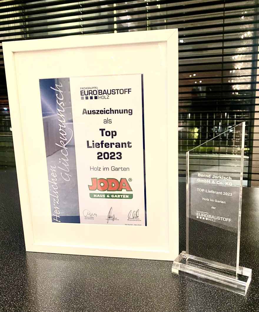 Joda® wurde erneut als TOP-Lieferant bei der EUROBAUSTOFF-Lieferantenprämierung ausgezeichnet. Die Eurobaustoff Handelsgesellschaft mbH & Co. KG ist Europas größte Einkaufskooperation für Holz und Baustoffe und bedient über 1.600 Fachhandelsstandorte. Rund 200 Gäste, Lieferanten und Fachhändler, der Branche waren beim „Fachgruppenabend Holz“ der Eurobaustoff in Düsseldorf dabei. Mittels der Bewertungskriterien Produktqualität, Service, Logistik und Vertriebsleistung werden im zweijährigen Rhythmus die TOP-Lieferanten der EUROBAUSTOFF gewählt. Joda® ist erneut Sieger als TOP-Lieferant in der Kategorie „Holz im Garten“.